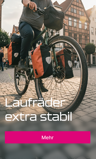 Neben einer sehr großen Auswahl an unterschiedlichen Vorderrädern und Hinterrädern – mit Nabe, Nabenschaltung oder Nabendynamo – sowie kompletten Laufradsätzen bieten wir Ihnen auch extra stabile Laufräder mit verstärkten Speichen an. Das kann besonders dann sinnvoll sein, wenn Ihre Laufräder am Fahrrad erhöhte Belastungen durch hohes Körpergewicht und/oder eine hohe Zuladung zuverlässig und dauerhaft verkraften sollen. So lässt sich das Risiko von Felgen- oder Speichenbrüchen deutlich reduzieren.