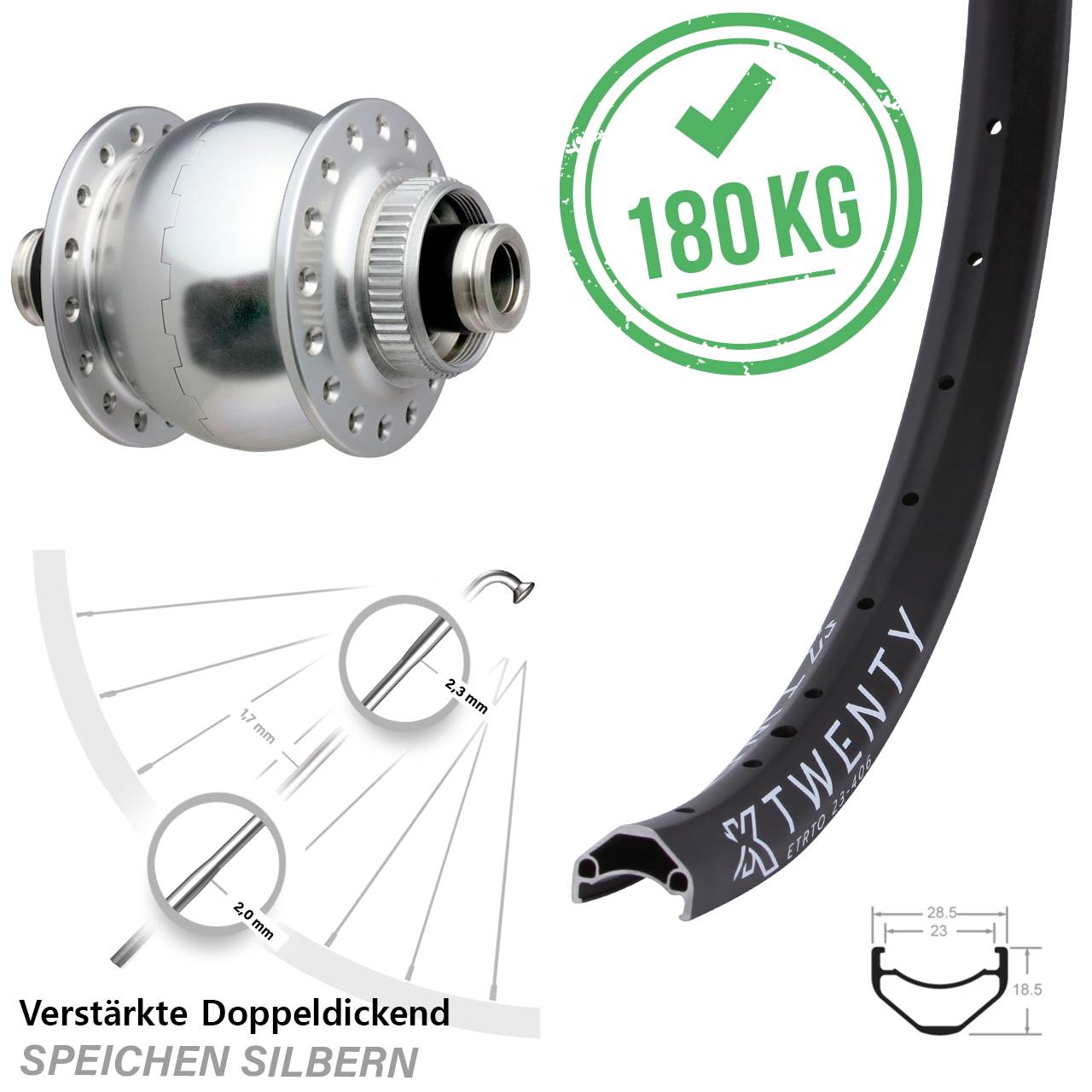 Dieses komplett eingespeichte und zentrierte 20 Zoll Vorderrad (Achsmaß 12x100 für Lastenrad besteht aus der schwarzen Felge KX Twenty, dem Nabendynamo SON 28-12 in der Farbe silbern und 32 silbernen verstärkten Sapim E-Light Doppeldickendspeichen.