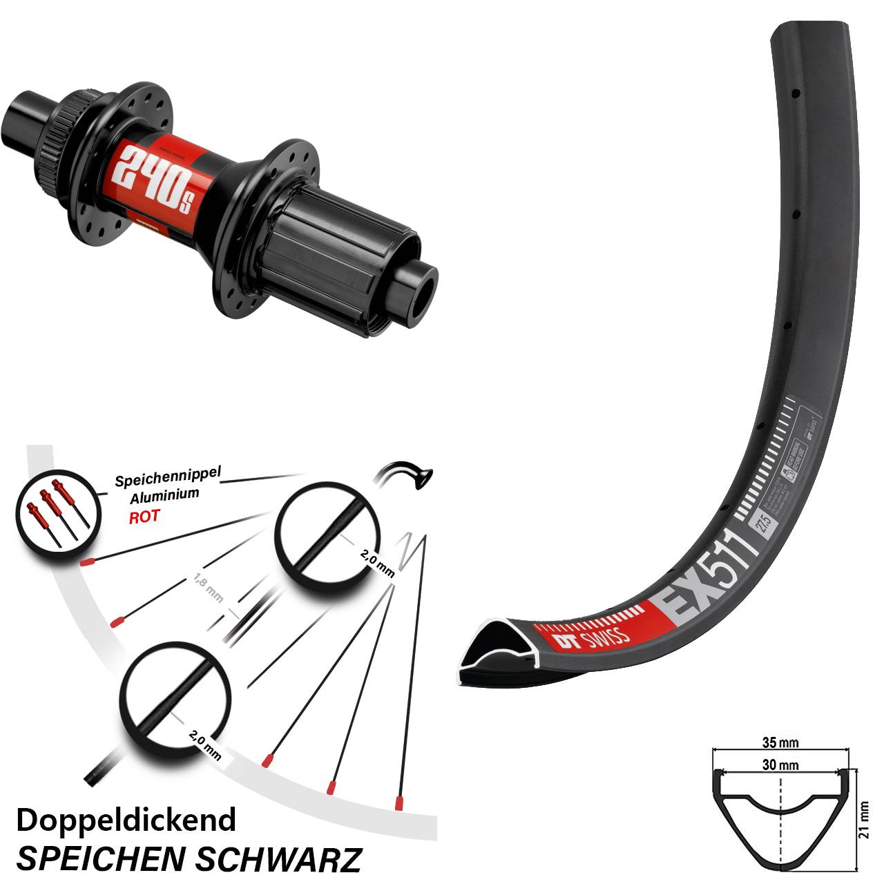 Produktbeschreibung 240s DT Swiss EX 511 Hinterrad 27,5 Zoll Boost 12x148 mm 28 Speichen Centerlock