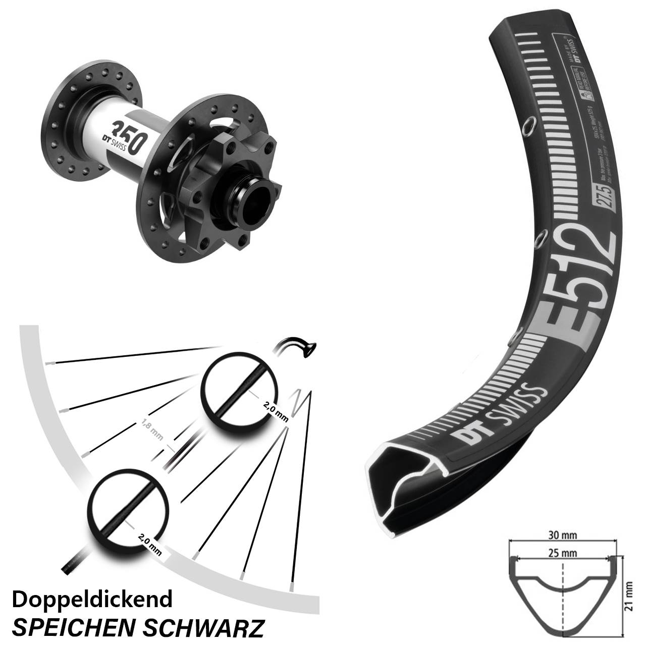 Dieses komplett eingespeichte und zentrierte 27,5 Zoll Vorderrad (Achsmaß 15x110) besteht aus den Komponenten: schwarze Felge DT Swiss E 512 Disc, der Vorderradnabe DT Swiss 350 in der Farbe schwarz und 32 schwarze Sapim Sprint Doppeldickendspeichen. Verwendet wird es an Mountainbike / MTB.
