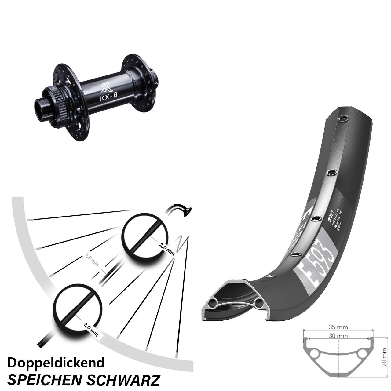 Dieses Vorderrad (Achsmaß 15x110 in der Größe 27,5 Zoll ist aus diesen Einzelkomponenten gefertigt: schwarze Felge DT Swiss E 593, Vorderradnabe KX-B in der Farbe schwarz und 32 schwarze Sapim Sprint Doppeldickendspeichen. Es ist bereits zentriert und komplett eingespeicht und ist für Mountainbike / MTB vorgesehen..