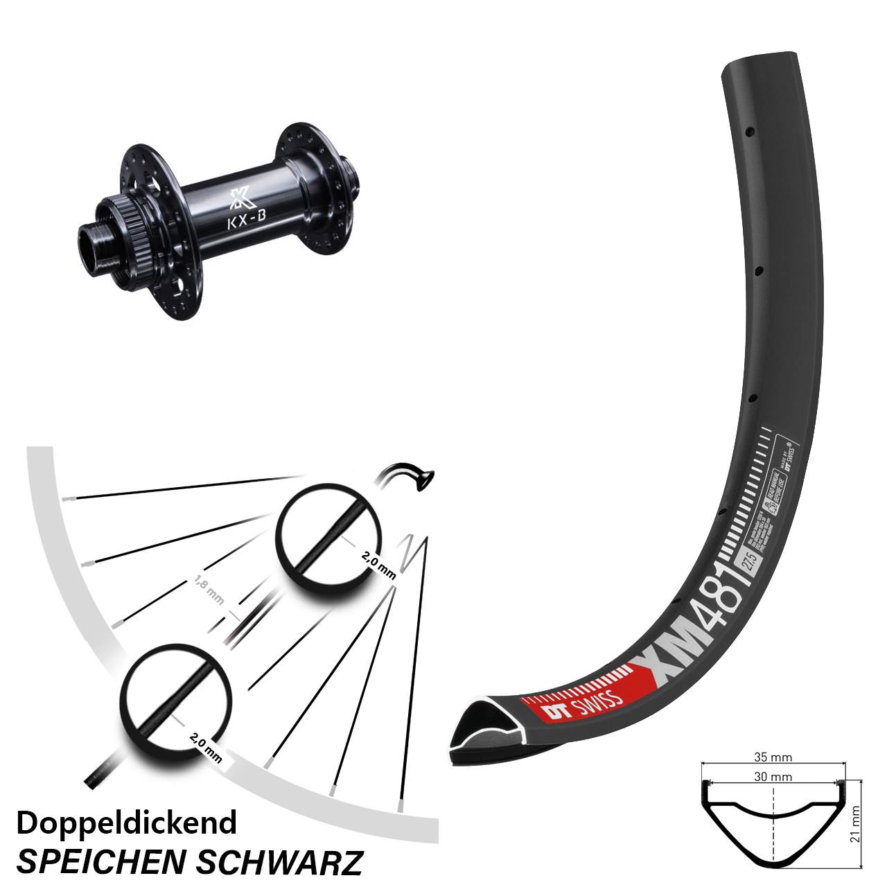 Technische Daten Vorderrad DT Swiss XM 481 Disc schwarz mit Nabe KX-B schwarz