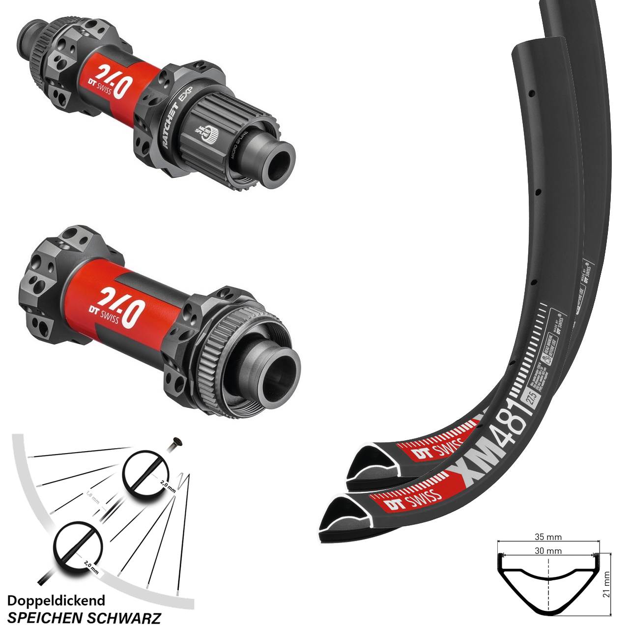 - 1 Hinterrad 27,5 Zoll XM 481 DT Swiss 240 EXP Boost 12x148 mm Straightpull Micro Spline (Auswahl zwischen Alunippel rot, Alunippel schwarz, Alunippel silbern, Messingnippel schwarz, Messingnippel silbern)