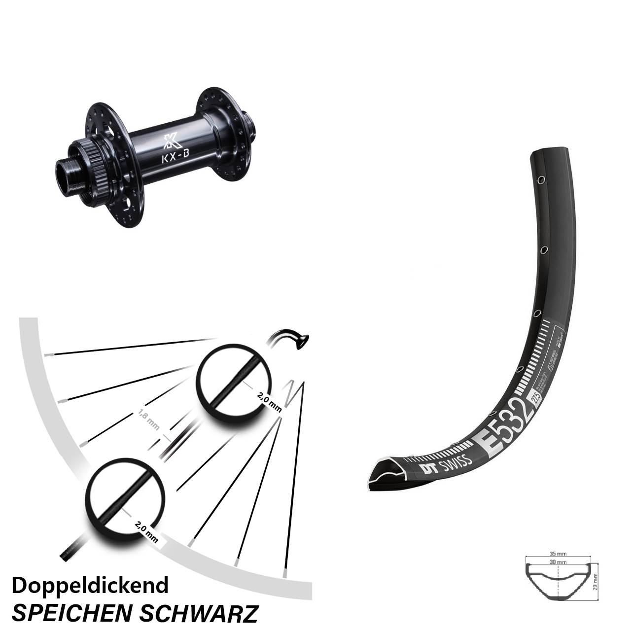 Dieses komplett eingespeichte und zentrierte 27,5 Zoll Vorderrad (Achsmaß 15x110 für Mountainbike / MTB besteht aus der schwarzen Felge DT Swiss E 532 Disc, der Vorderradnabe KX-B in der Farbe schwarz und 28 schwarzen Sapim Sprint Doppeldickendspeichen.