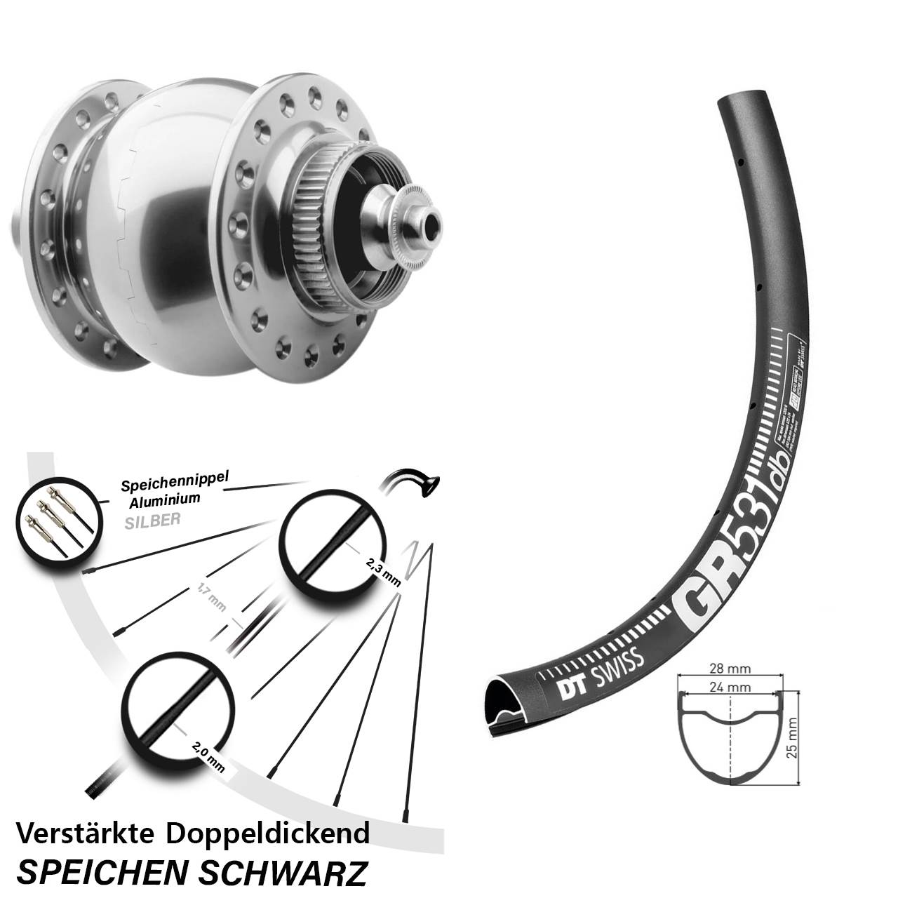 Technische Daten Vorderrad DT Swiss GR 531 Disc schwarz mit Nabendynamo SON 28 silbern
