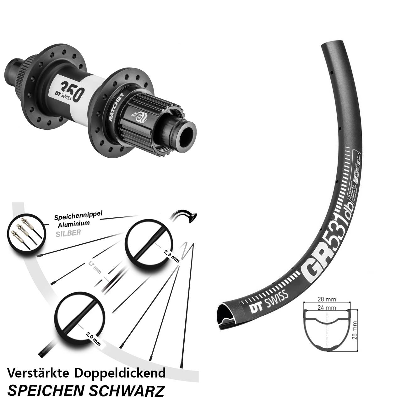 - Speichenstärke: 2,3-1,7-2,0 mm Edelstahl