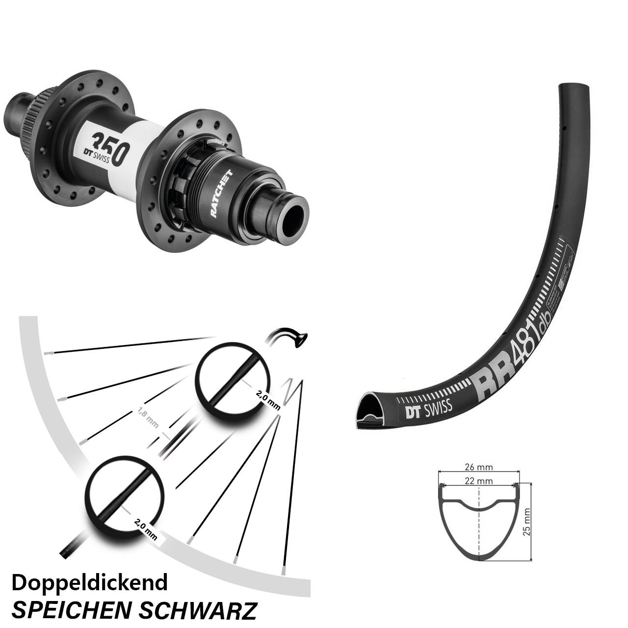 Technische Daten Hinterrad DT Swiss RR 481 Disc schwarz mit Nabe DT Swiss 350 Ratchet 36 schwarz