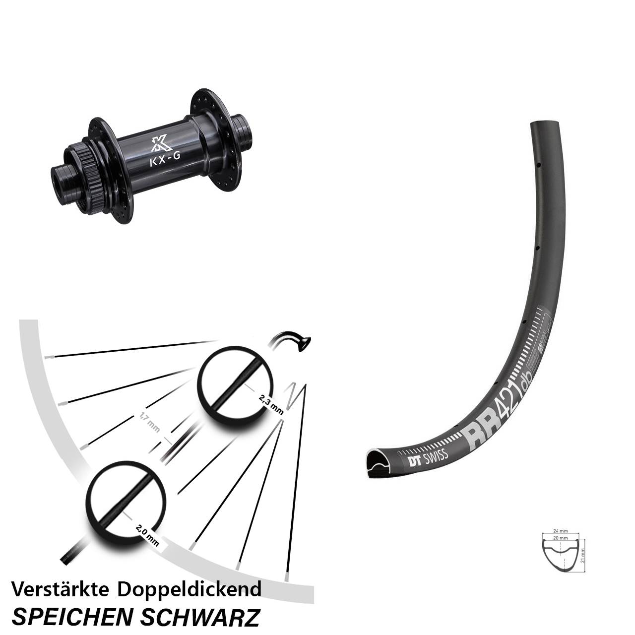 Technische Daten Vorderrad DT Swiss RR 421 Disc schwarz mit Nabe KX-G Steckachse schwarz