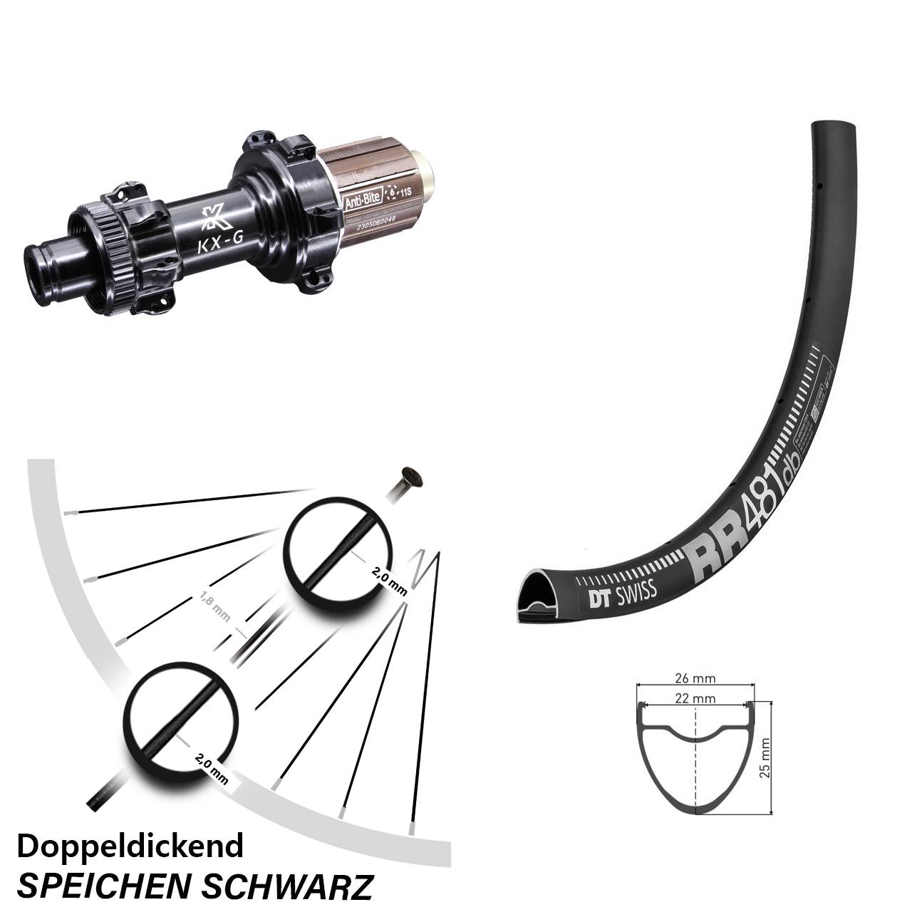 Technische Daten Hinterrad DT Swiss RR 481 Disc schwarz mit Nabe KX-G Straightpull Steckachse schwarz