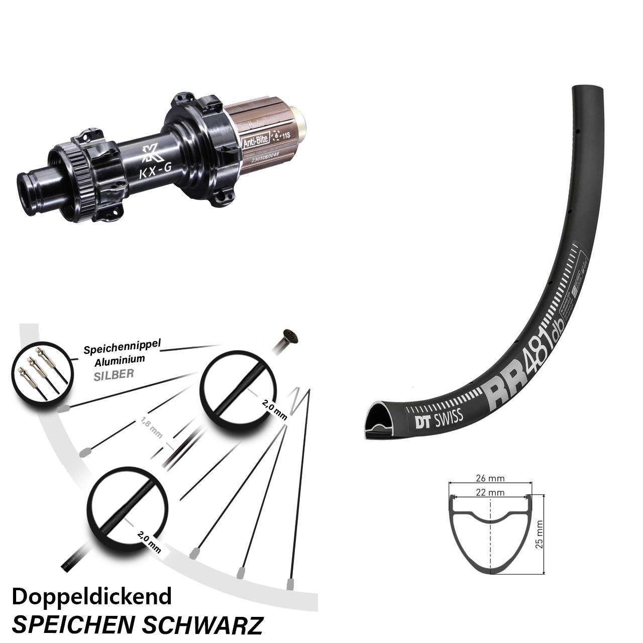 Diese KX-G Hinterradnabe für Steckachse (12 mm) können Sie später problemlos mit einem entsprechenden Achsadapter auch auf eine 5/142 mm (Alumnium) oder 5/142 mm (Stahl) Aufnahme für Schnellspanner umrüsten. - Felge: Die schwarze DT Swiss Felge RR 481 DB ist eine extra stabile und sehr robuste Hohlkammer-Fahrradfelge, dank der Fertigung aus Aluminium jedoch recht leicht. Das Modell RR 481 DB verwendet Nippellöcher mit Unterlegscheibe und weist ein breites und verstärktes Profil auf, optimal also, wenn es mal etwas rauer zugeht, z.B. abseits gut ausgebauter Straßen. Die saubere und sehr hochwertige Verarbeitung der schwarzen DT Swiss RR 481 DB Aluminium-Felge sorgt zudem für eine hohe Langlebigkeit. Auf der RR 481 DB Felge (Maulweite 22 mm, Höhe 25 mm, Breite 26 mm) können auch breitere Reifen aufgezogen werden. Sie ist für den Einsatz am Rennrad Gravelbike. Die DT Swiss RR 481 DB Felge ist für Scheibenbremsen konzipiert. Mit bis zu 130 kg Systemgewicht ist die Felge RR 481 DB vom Schweizer Markenhersteller DT Swiss belastbar und stabil ausgeführt. Optimal also, wenn das Bike mit schwerem Gewicht (z.B. in den Packtaschen) beladen wird. Diese Felge ist unter anderem auch für "Tubeless Ready (TLR)" konzipiert.