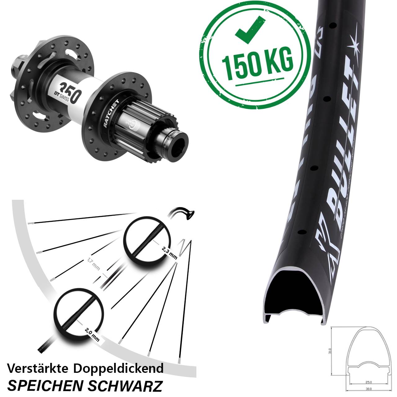 - zulässiges Systemgewicht: 150 kg mit Messingnippeln (120 kg mit Alunippeln) - extra stabiles Laufrad