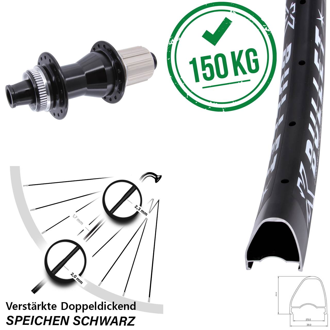 - zulässiges Systemgewicht: 150 kg mit Messingnippeln (120 kg mit Alunippeln) - extra stabiles Laufrad