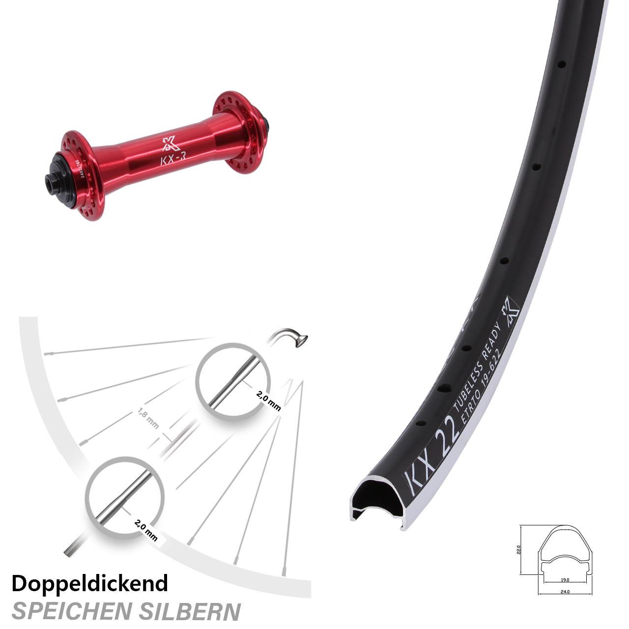 Technische Daten Vorderrad KX 22 schwarz mit Nabe KX-R Rennrad rot