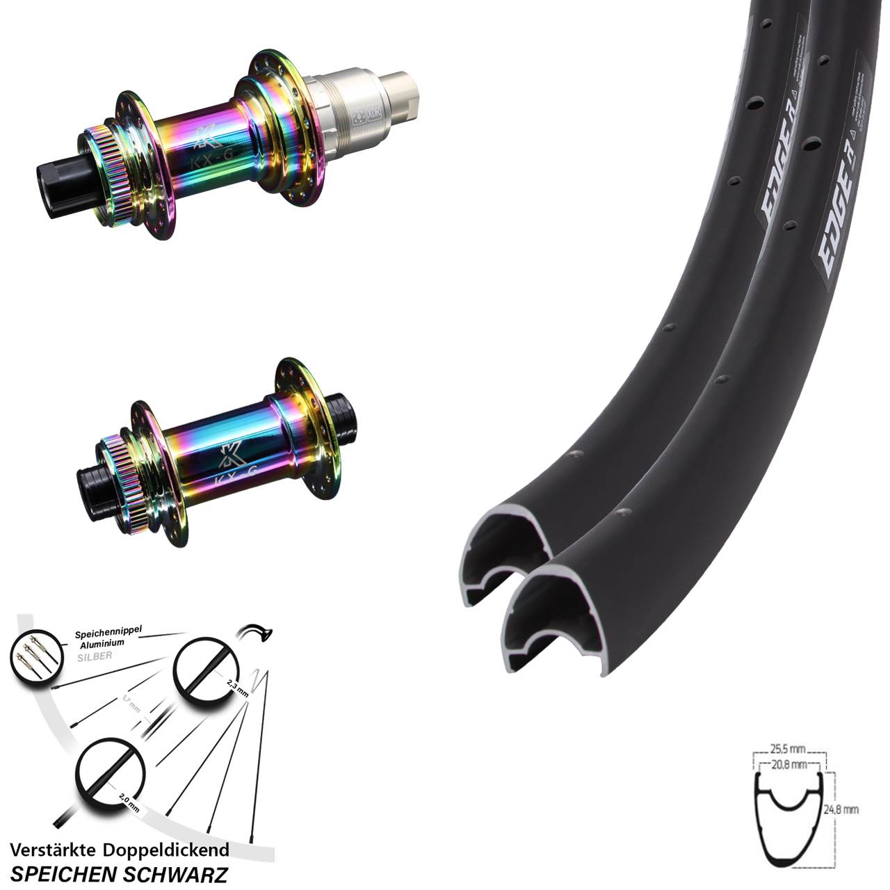 - 1 28 Zoll Ryde Edge R25 Offset KX-G Oilslick Centerlock Hinterrad 12x142 XDR 11-12 fach (Auswahl zwischen Alunippel rot, Alunippel schwarz, Alunippel silbern, Messingnippel schwarz, Messingnippel silbern)