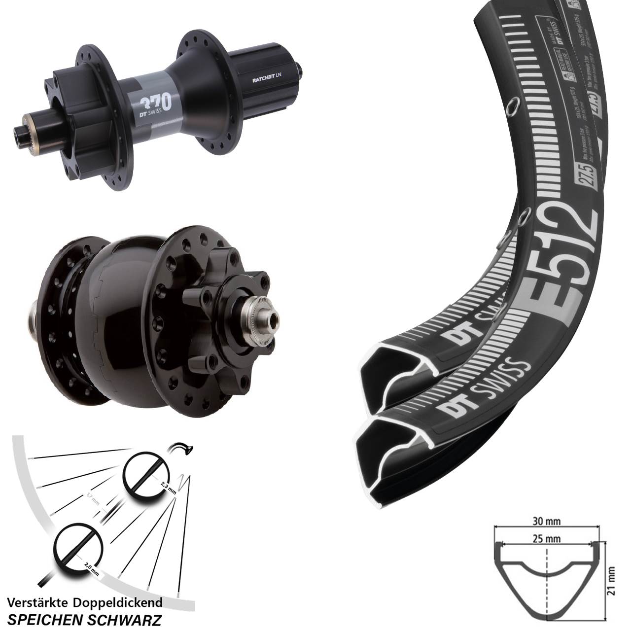 - Modell Vorderradnabe / Hinterradnabe: DT Swiss 370 Ratchet LN SON 28 schwarz