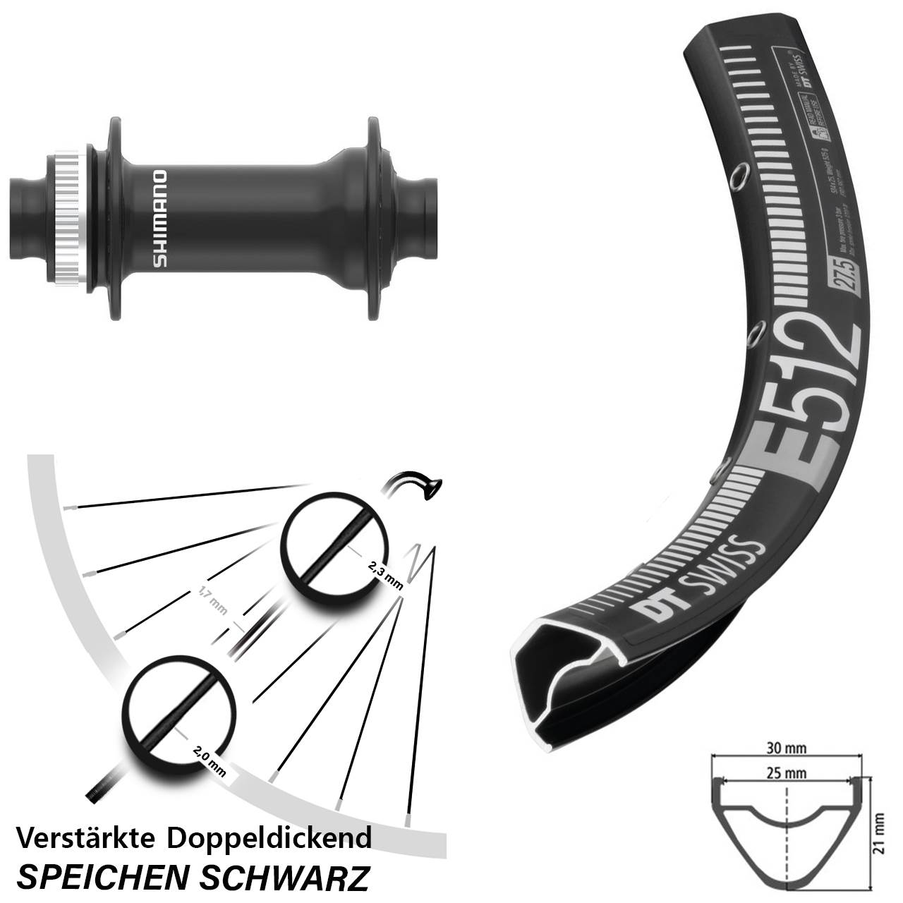 Technische Daten Vorderrad DT Swiss E 512 Disc schwarz mit Nabe Shimano HB-MT410-B schwarz