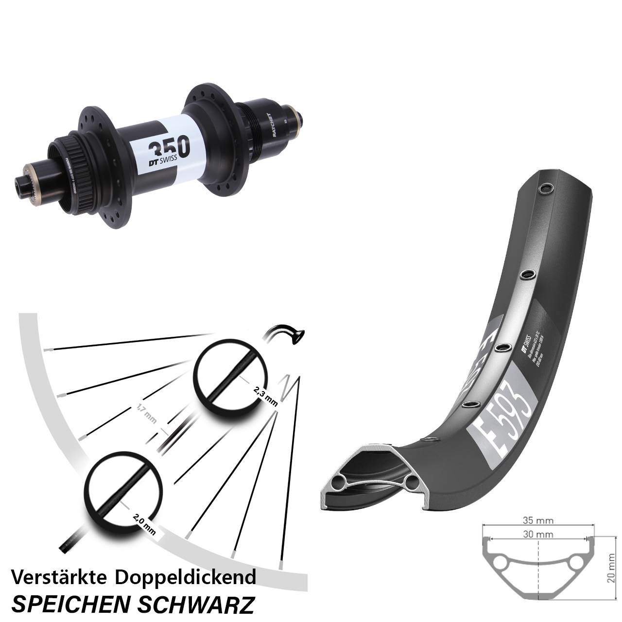 Technische Daten Hinterrad DT Swiss E 593 schwarz mit Nabe DT Swiss 350 Ratchet 36 schwarz