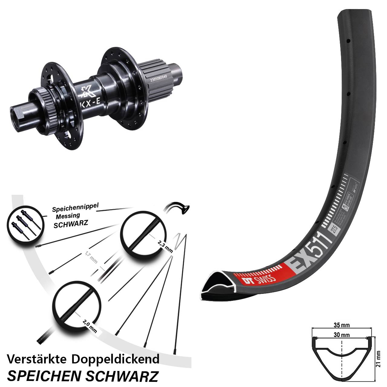 Technische Daten Hinterrad DT Swiss EX 511 Disc schwarz mit Nabe KX-E Heavy Duty schwarz