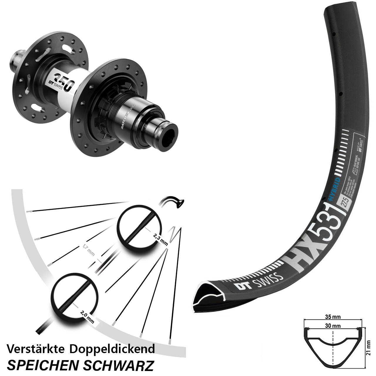 Technische Daten Hinterrad DT Swiss HX 531 Disc schwarz mit Nabe DT Swiss 350 DEG72 schwarz