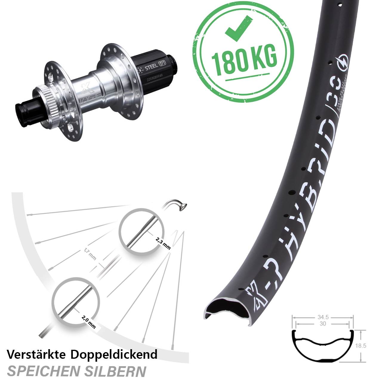 Technische Daten Hinterrad KX-R Hybrid 30 schwarz mit Nabe KX-E verstärkt silbern
