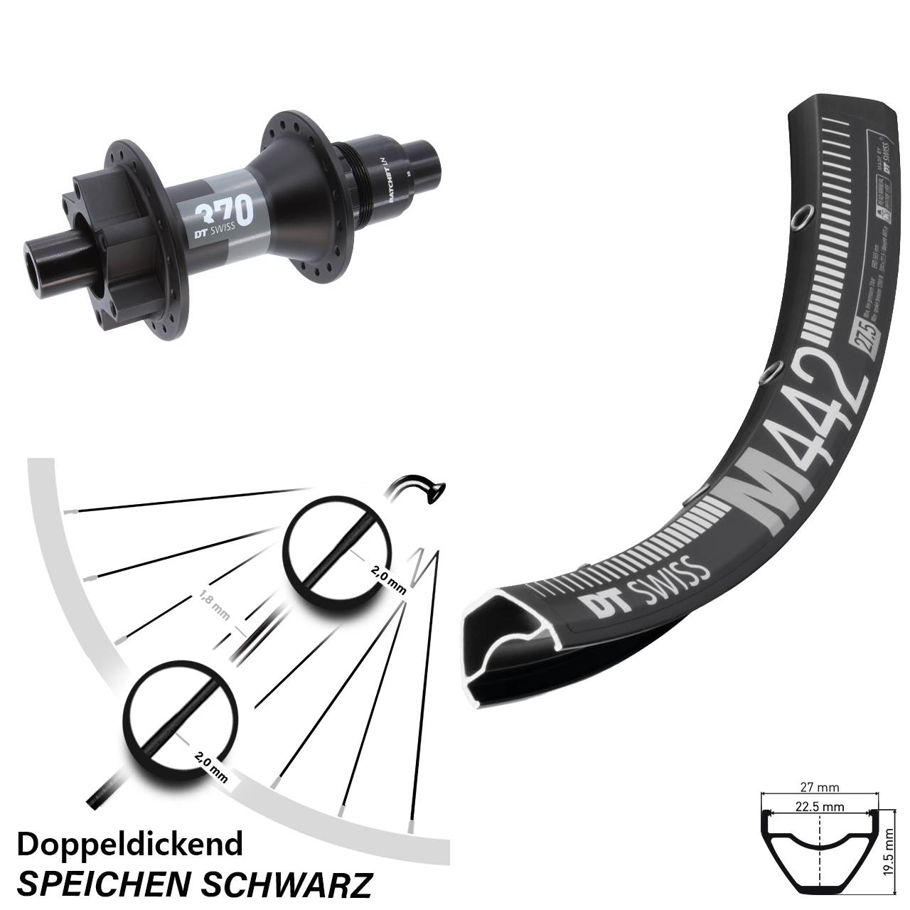 Dieses zentrierte und komplett eingespeichte 28-29 Zoll Hinterrad (Achsmaß 12x148) besteht aus den Komponenten: schwarze Felge DT Swiss M 442 Disc, Hinterradnabe DT Swiss 370 Ratchet LN in der Farbe schwarz und 32 schwarze Sapim Sprint Doppeldickendspeichen. Verwendet wird es an Mountainbike / MTB.