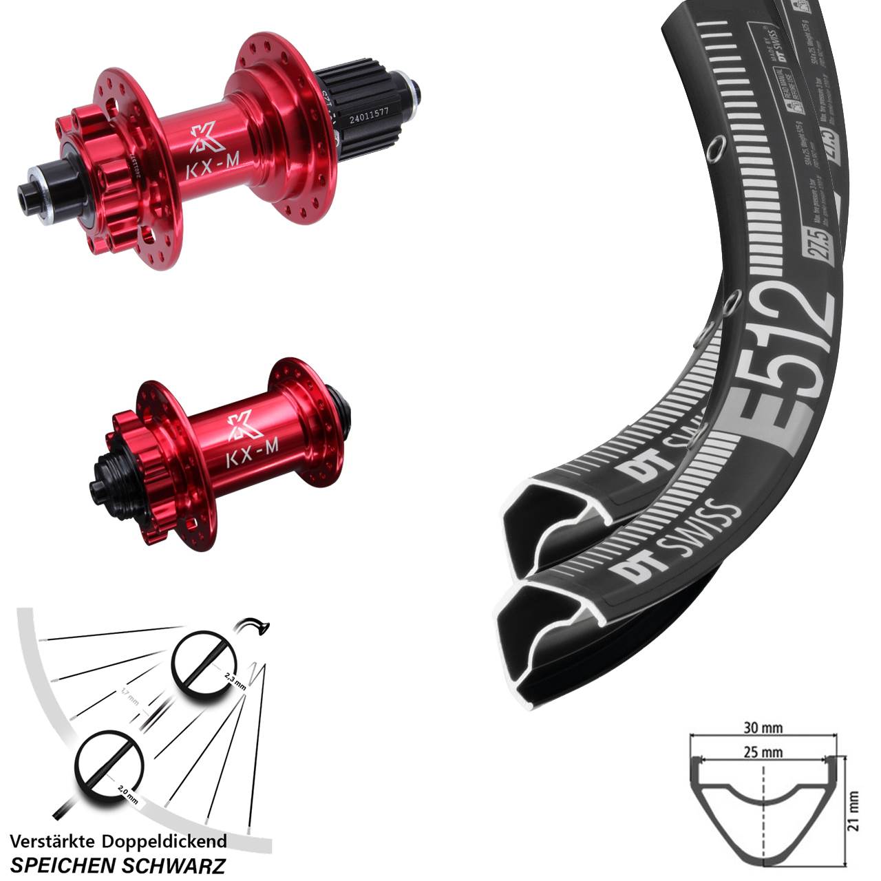 Dieser Laufradsatz mit den Achsmaßen von 5x100 (für Schnellspanner) 5x135 (für Schnellspanner) in der Größe 29 Zoll ist aus diesen Einzelkomponenten gefertigt: schwarze Felgen DT Swiss E 512 Disc, Naben KX-M in der Farbe rot und 32 schwarze verstärkte Sapim E-Light Doppeldickendspeichen. Er ist bereits komplett eingespeicht und zentriert. Verwendet wird er an Mountainbike / MTB.