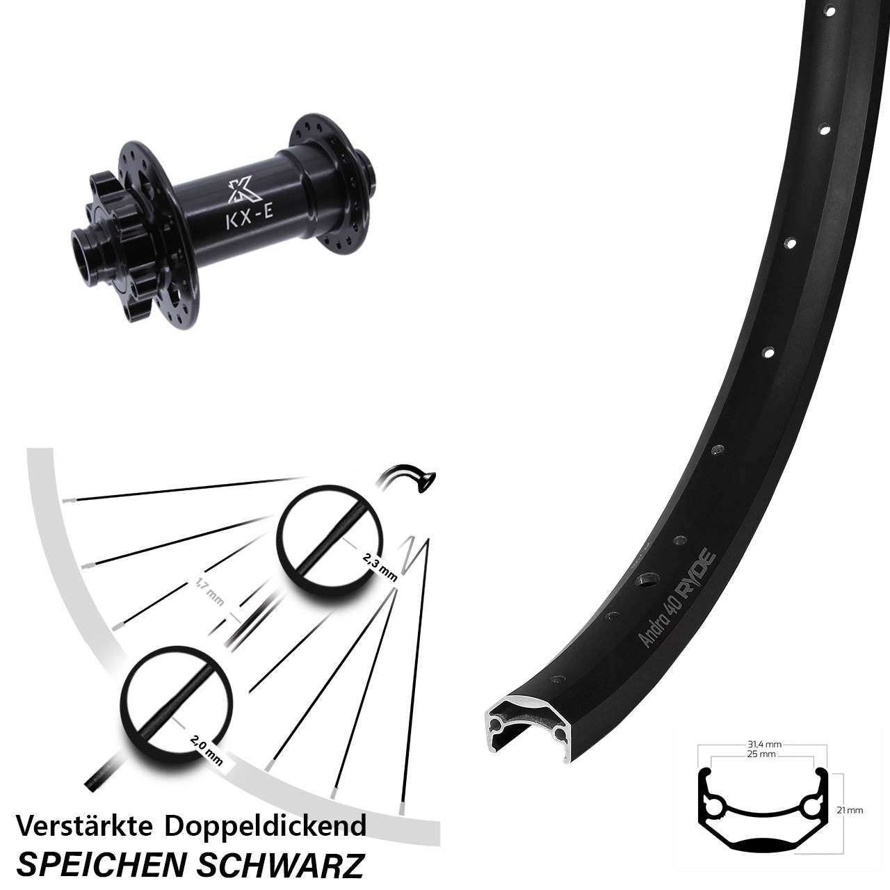 Technische Daten Vorderrad Ryde Andra 40 Disc schwarz mit Nabe KX-E Heavy Duty schwarz