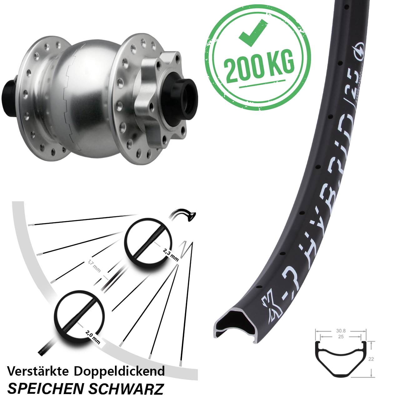 - Vorderrad 28 Zoll 29 Zoll KX-R Hybrid 25 schwarz mit Nabendynamo SON 28 silbern silbern