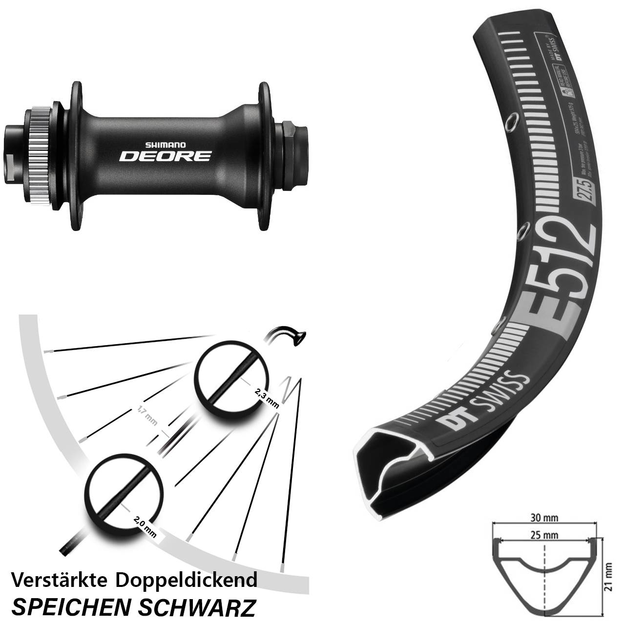 Dieses Vorderrad (Achsmaß 15x110 in der Größe 29 Zoll ist aus diesen Einzelkomponenten gefertigt: schwarze Felge DT Swiss E 512 Disc, Vorderradnabe Shimano HB-M618-B in der Farbe schwarz und 32 schwarze verstärkte Sapim E-Light Doppeldickendspeichen. Es ist bereits komplett eingespeicht und zentriert und ist für Mountainbike / MTB vorgesehen..