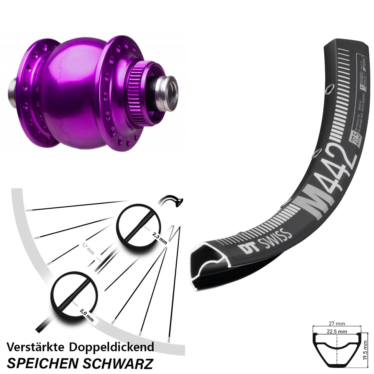 Technische Daten Vorderrad DT Swiss M 442 Disc schwarz mit Nabendynamo SON 28-12 violett
