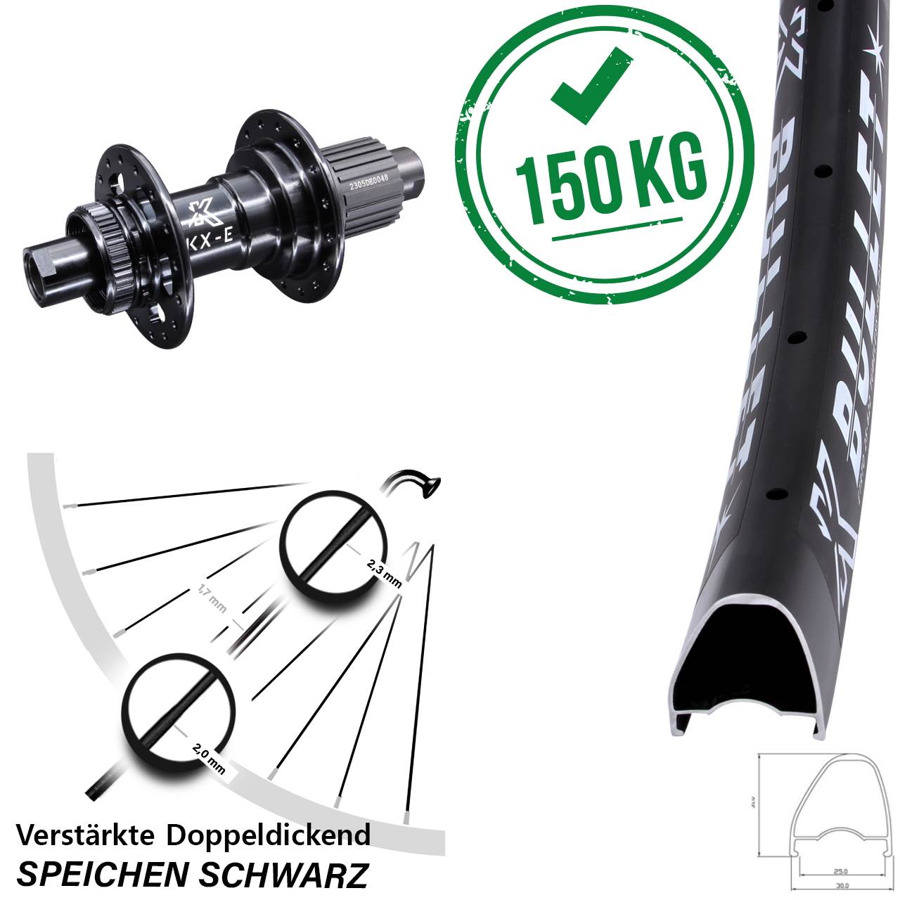 Technische Daten Hinterrad KX Bullet OS schwarz mit Nabe KX-E Heavy Duty schwarz