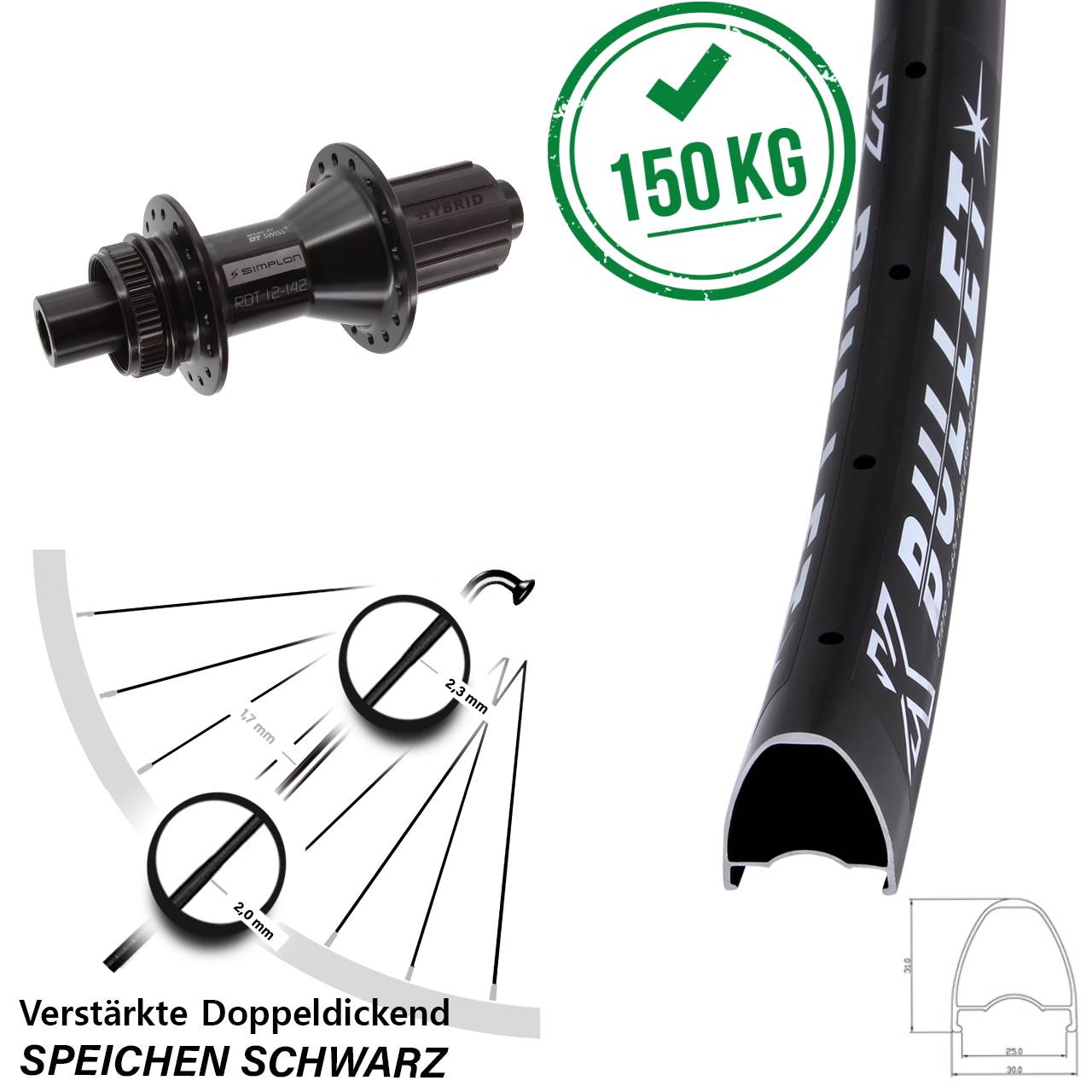- zulässiges Systemgewicht: 150 kg mit Messingnippeln (120 kg mit Alunippeln) - extra stabiles Laufrad