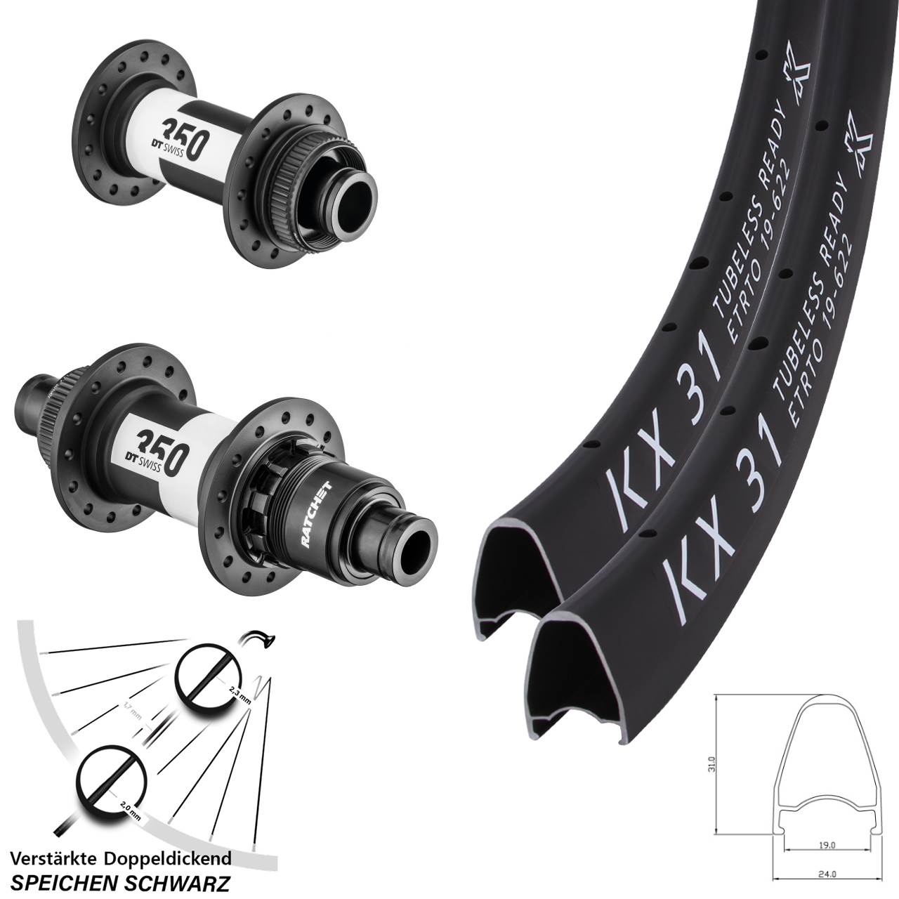Centerlock Laufradsatz 28 Zoll KX 31 DT Swiss 350 XDR 11-12 fach 15x100 12x142 mit verstärkten Doppeldickendspeichen