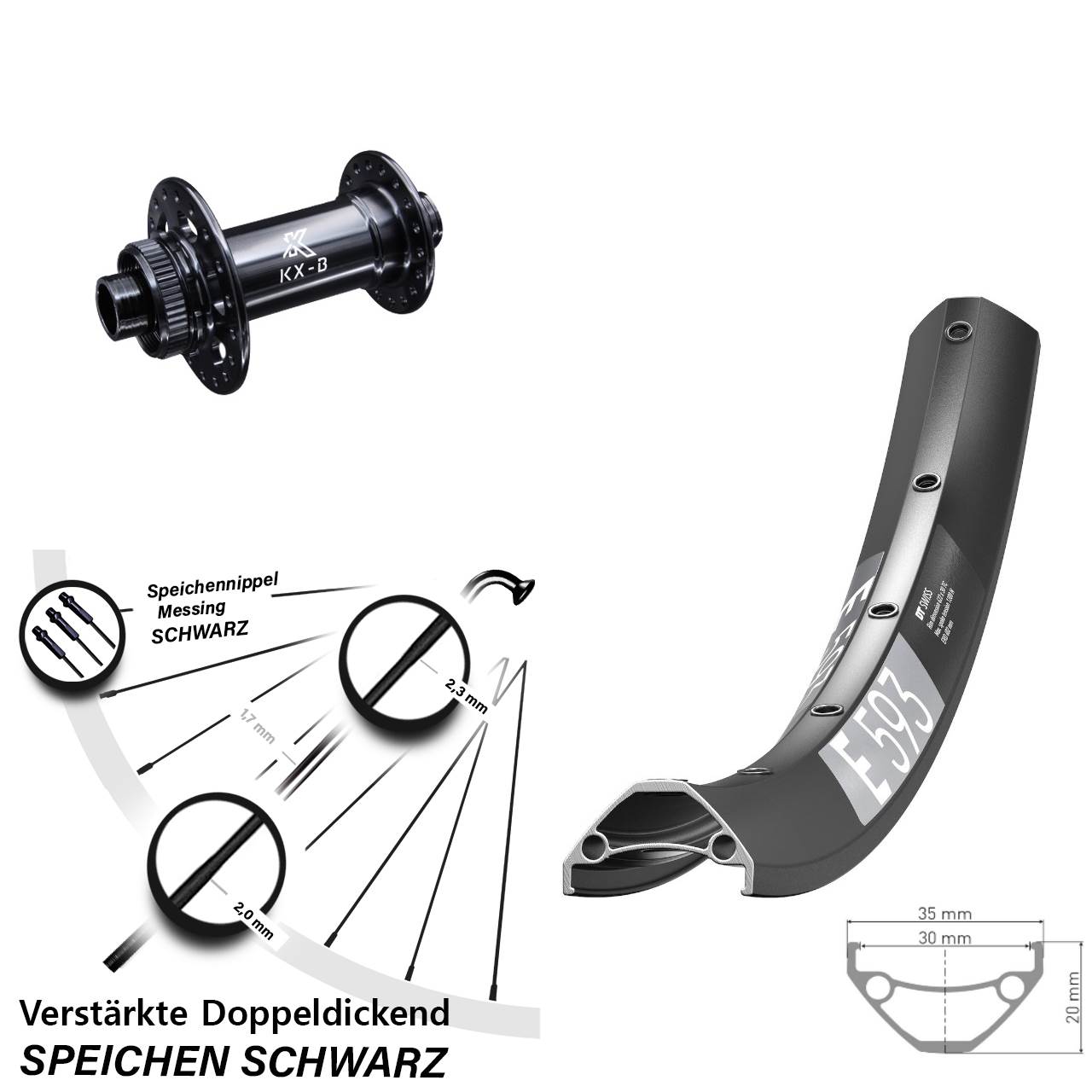 Technische Daten Vorderrad DT Swiss E 593 schwarz mit Nabe KX-B schwarz
