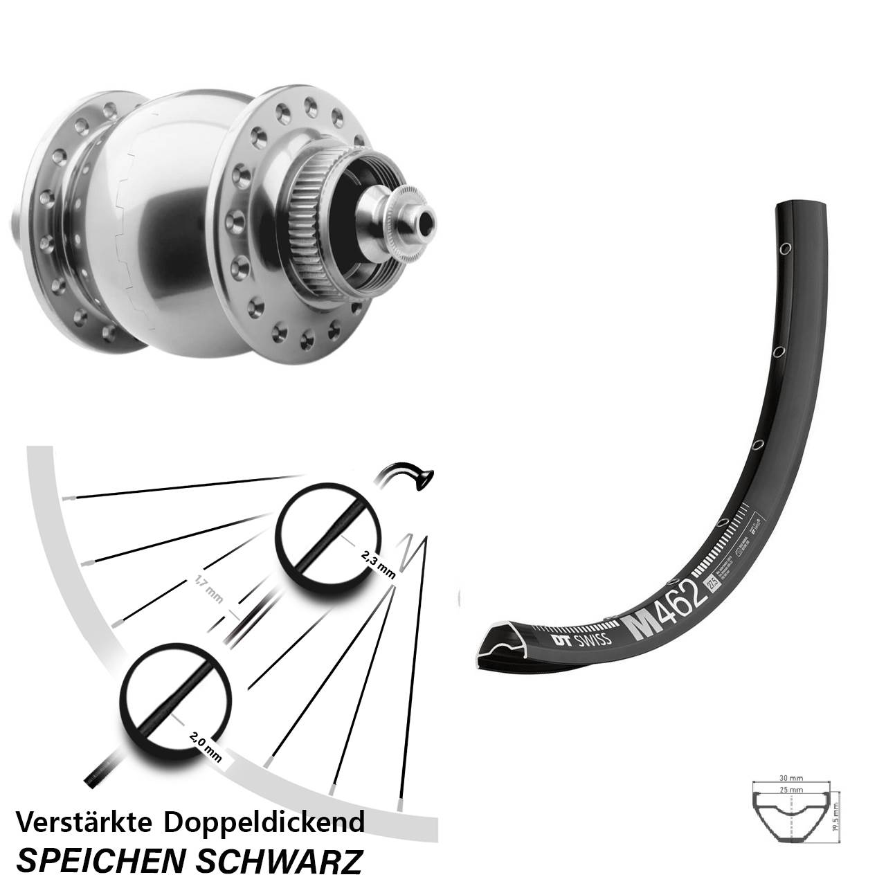 Technische Daten Vorderrad DT Swiss M 462 Disc schwarz mit Nabendynamo SON 28 silbern