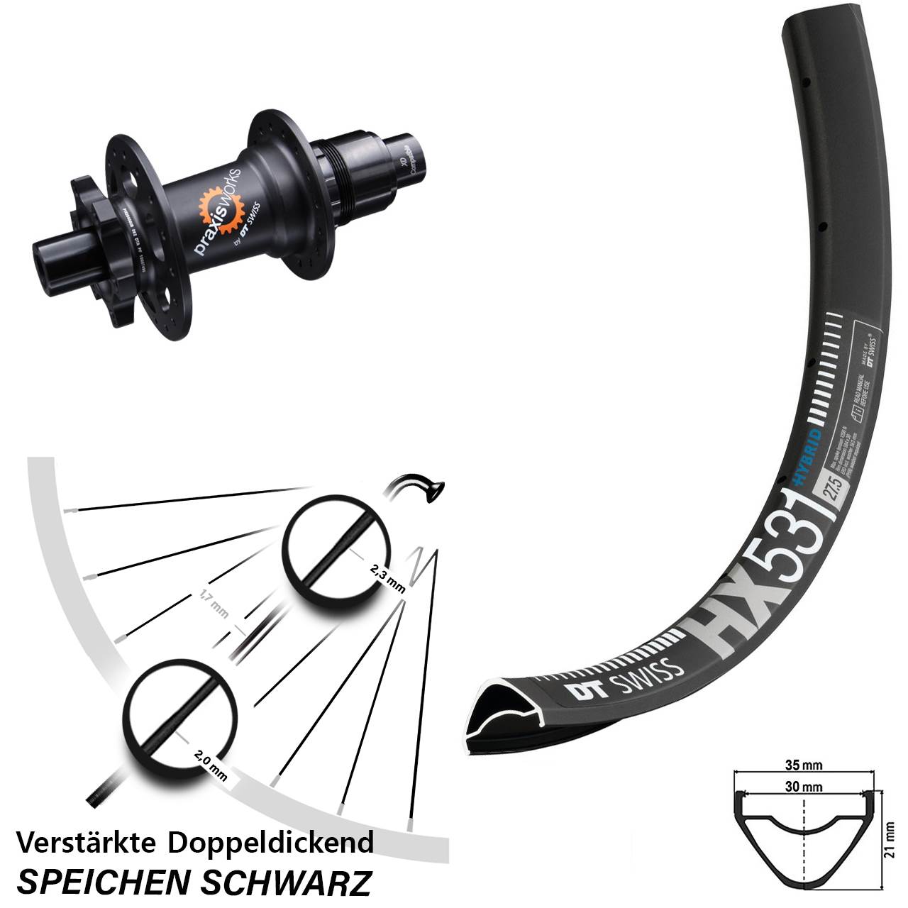 Technische Daten Hinterrad DT Swiss HX 531 Disc schwarz mit Nabe DT Swiss 350 SL Ratchet schwarz