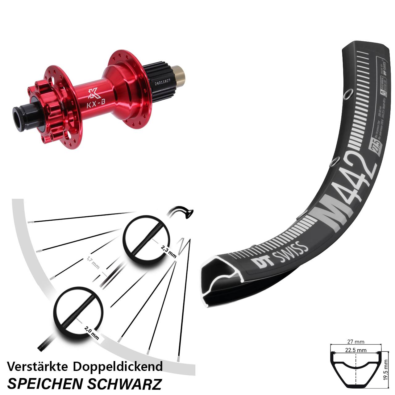 Technische Daten Hinterrad DT Swiss M 442 Disc schwarz mit Nabe KX-B rot