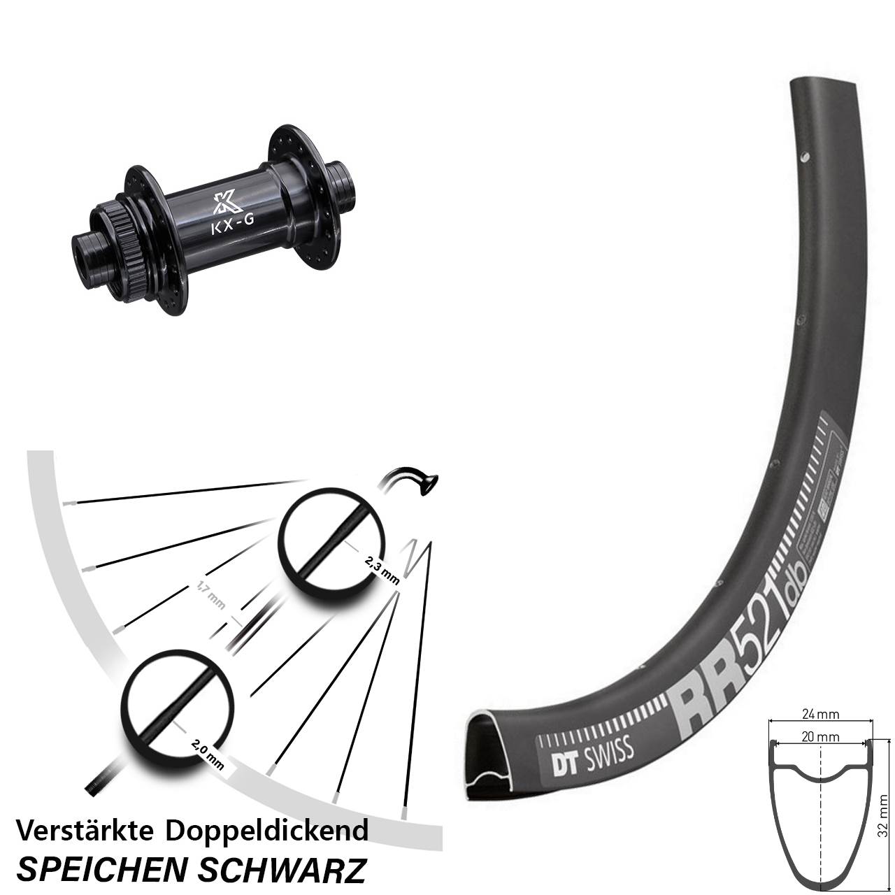 Technische Daten Vorderrad DT Swiss RR 521 Disc schwarz mit Nabe KX-G Steckachse schwarz
