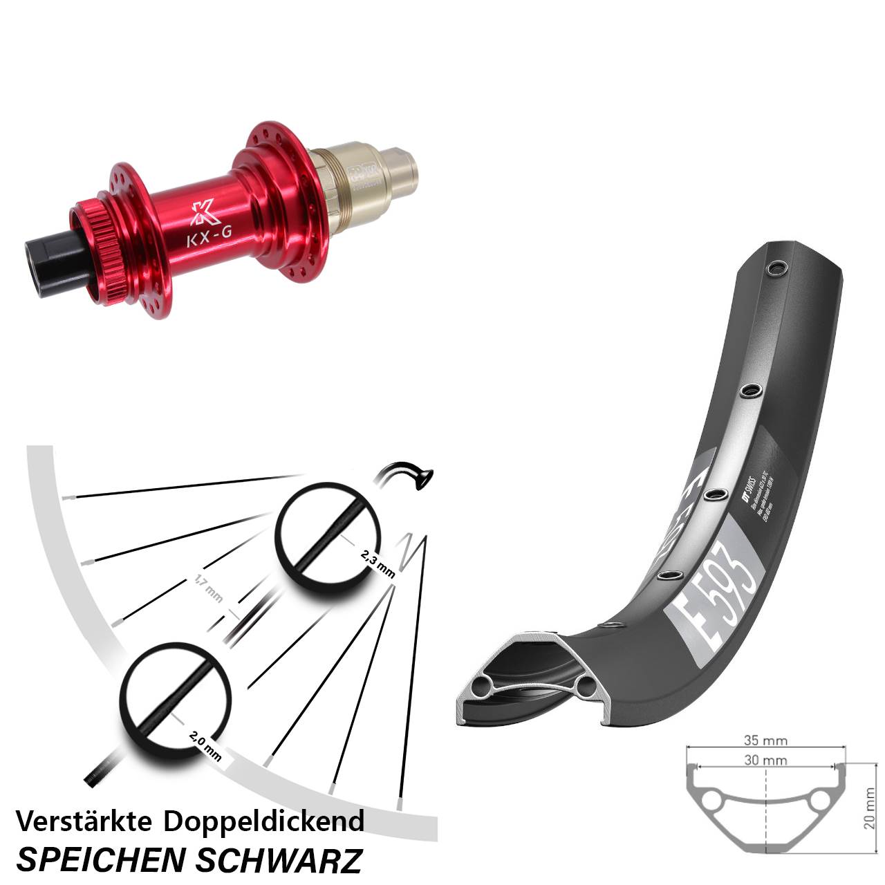 Technische Daten Hinterrad DT Swiss E 593 schwarz mit Nabe KX-G rot
