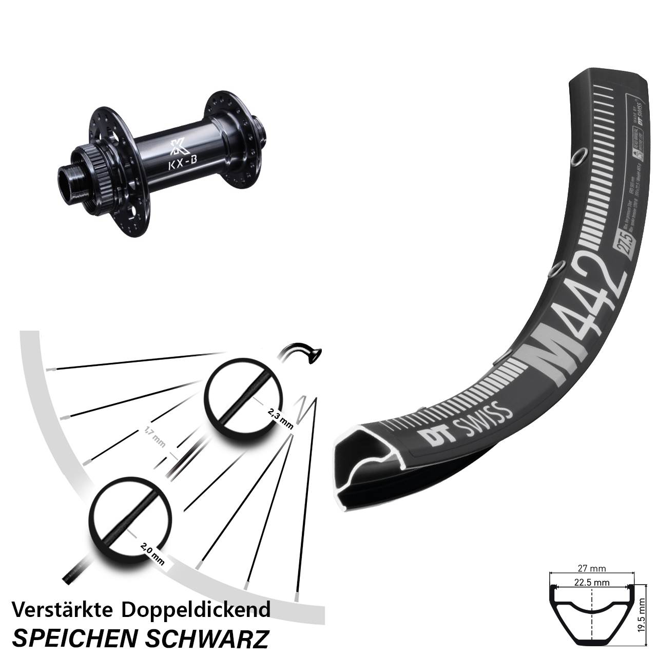 Technische Daten Vorderrad DT Swiss M 442 Disc schwarz mit Nabe KX-B schwarz