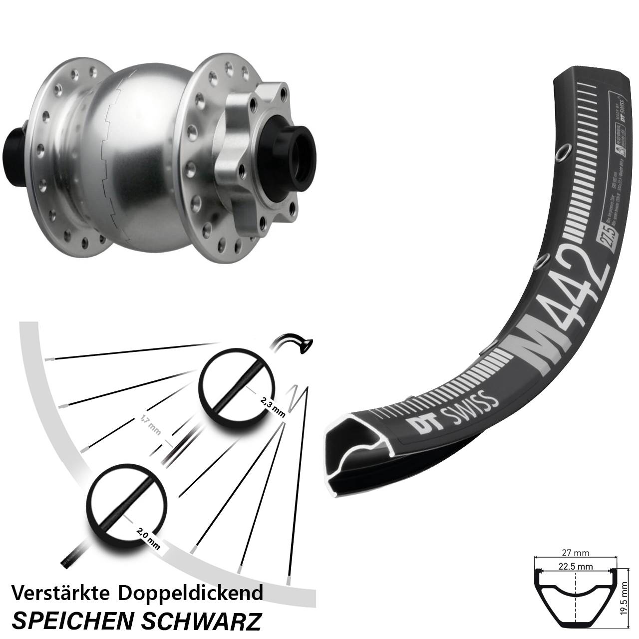 Technische Daten Vorderrad DT Swiss M 442 Disc schwarz mit Nabendynamo SON 28-15-110 silbern