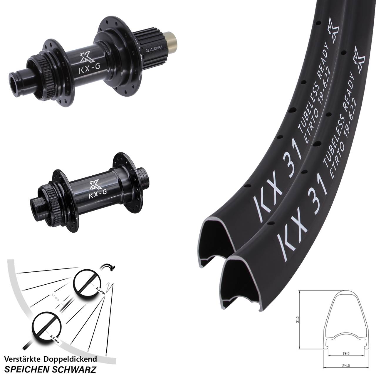 - 1 KX-G 31 Gravel 28 Zoll Vorderrad Centerlock 12x100 (Auswahl zwischen Alunippel rot, Alunippel schwarz, Alunippel silbern, Messingnippel schwarz, Messingnippel silbern)