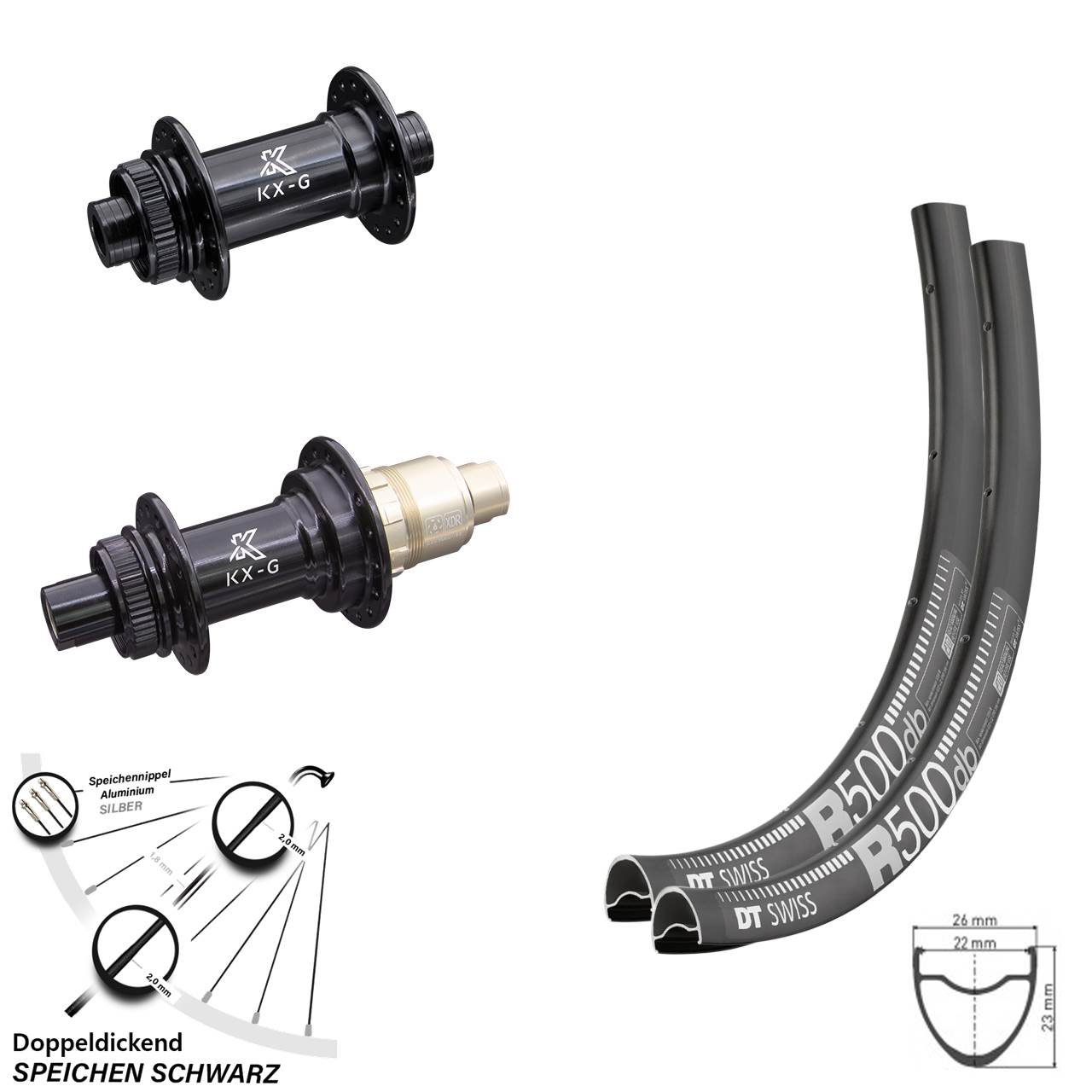 - 1 28 Zoll Hinterrad DT Swiss R 500 mit KX-G Nabe Steckachse 12x142 mm Sram XDR (Auswahl zwischen Alunippel rot, Alunippel schwarz, Alunippel silbern, Messingnippel schwarz, Messingnippel silbern)