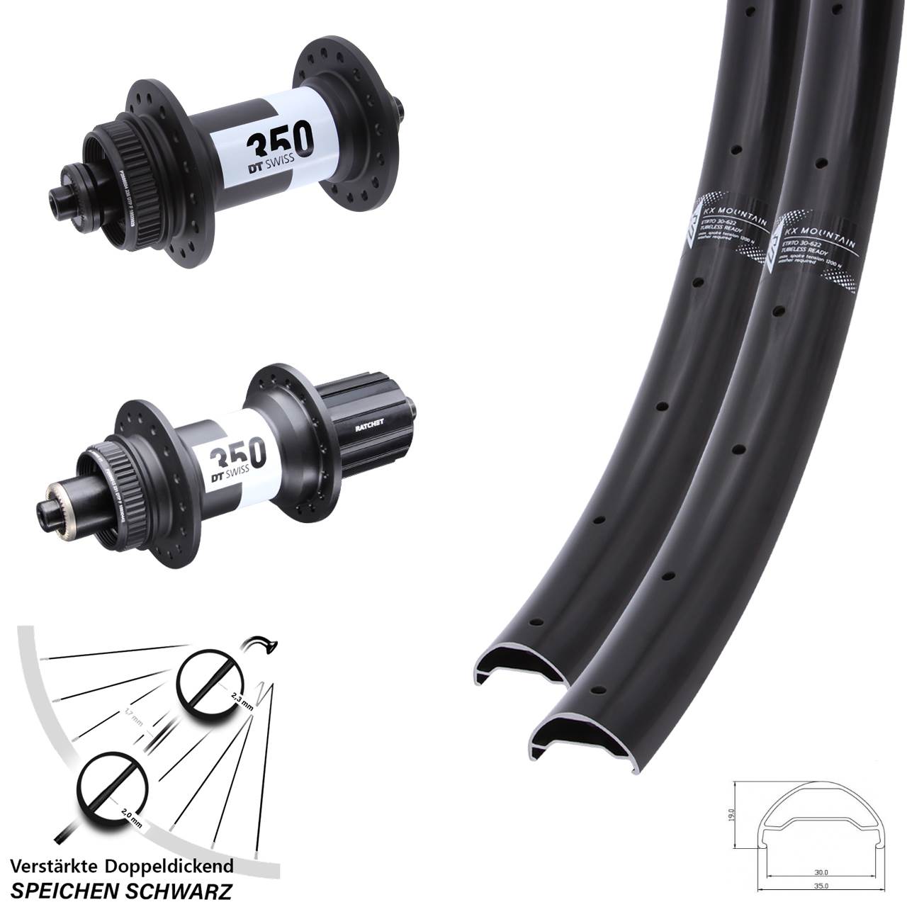Dieser Laufradsatz in der Größe 29 Zoll mit den Achsmaßen von 5x100 (für Schnellspanner) 5x135 (für Schnellspanner) ist aus den folgenden Komponenten aufgebaut: schwarze Felgen KX Mountain, Naben DT Swiss 350 DT Swiss 350 Ratchet 36 in der Farbe schwarz und 32 schwarze verstärkte Sapim E-Light Doppeldickendspeichen. Verwendet wird er an Mountainbike / MTB. Er ist zentriert und komplett eingespeicht.