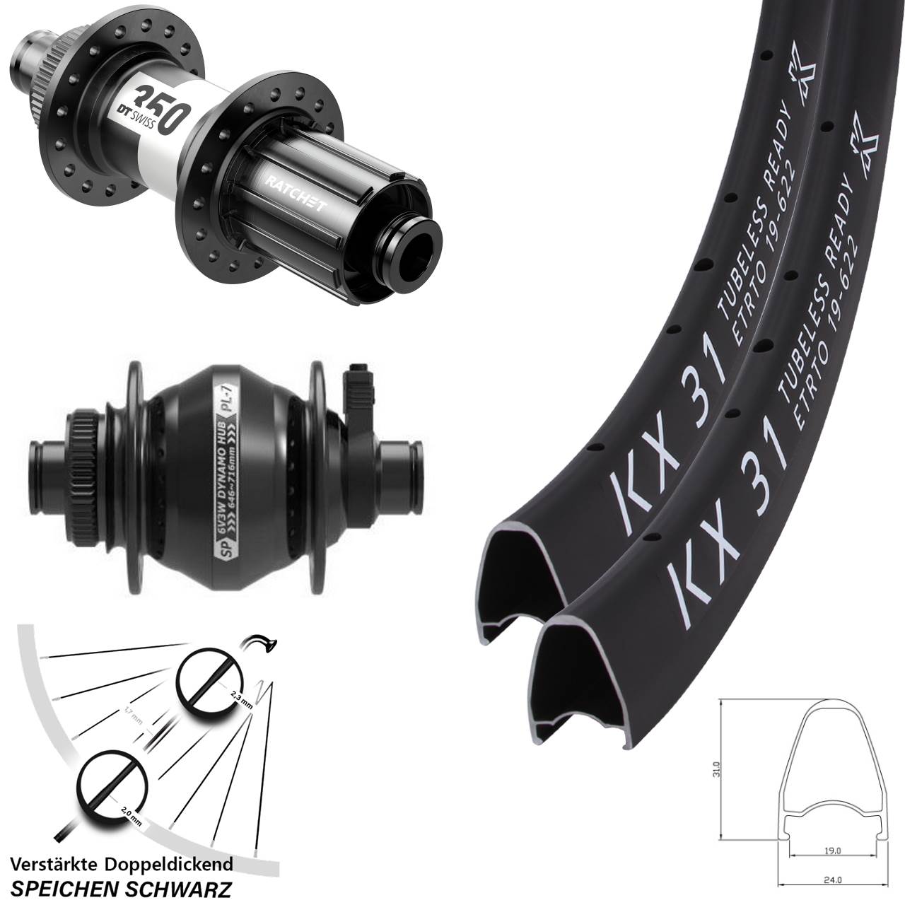 - Speichenstärke: 2,3-1,7-2,0 mm Edelstahl