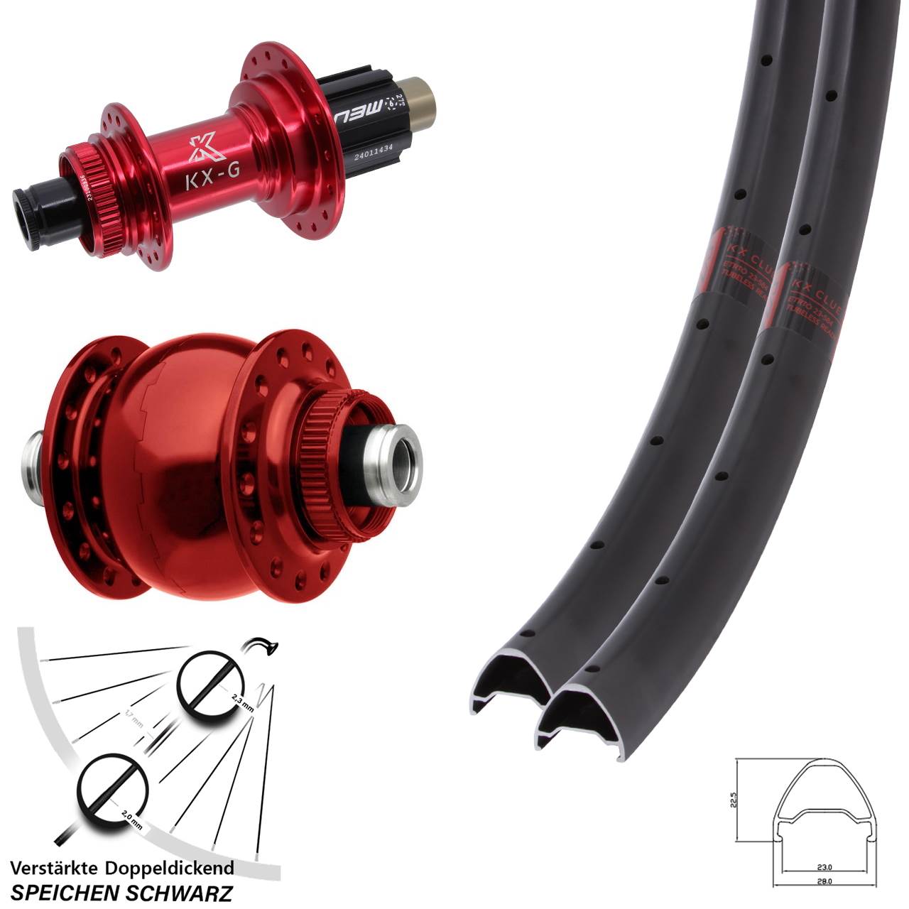 Dieser zentrierte und komplett eingespeichte 28-29 Zoll Laufradsatz mit den Achsmaßen von 12x100 12x142 besteht aus den Komponenten: schwarze Felgen KX Clue, Naben KX-G SON 28-12 Disc Centerlock in der Farbe rot und im Vorderrad 28 und im Hinterrad 32 schwarze verstärkte Sapim E-Light Doppeldickendspeichen. Verwendet wird er an Gravelbike.