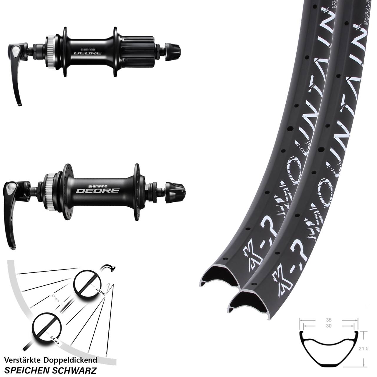 Dieser zentrierte und komplett eingespeichte 29 Zoll Laufradsatz mit den Achsmaßen von 5x100 (für Schnellspanner) 5x135 (für Schnellspanner) für Mountainbike / MTB besteht aus den schwarzen Felgen KX-R Mountain, den Naben Shimano FH-M6000 Shimano HB-M6000 in der Farbe schwarz und 32 schwarzen verstärkten Sapim E-Light Doppeldickendspeichen.
