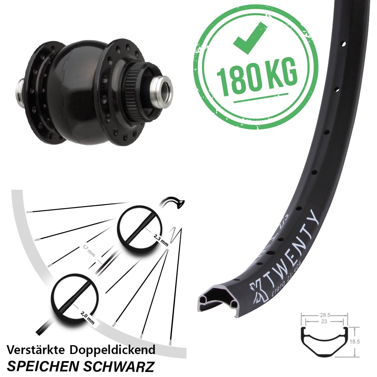 - Speichenstärke: 2,3-1,7-2,0 mm Edelstahl