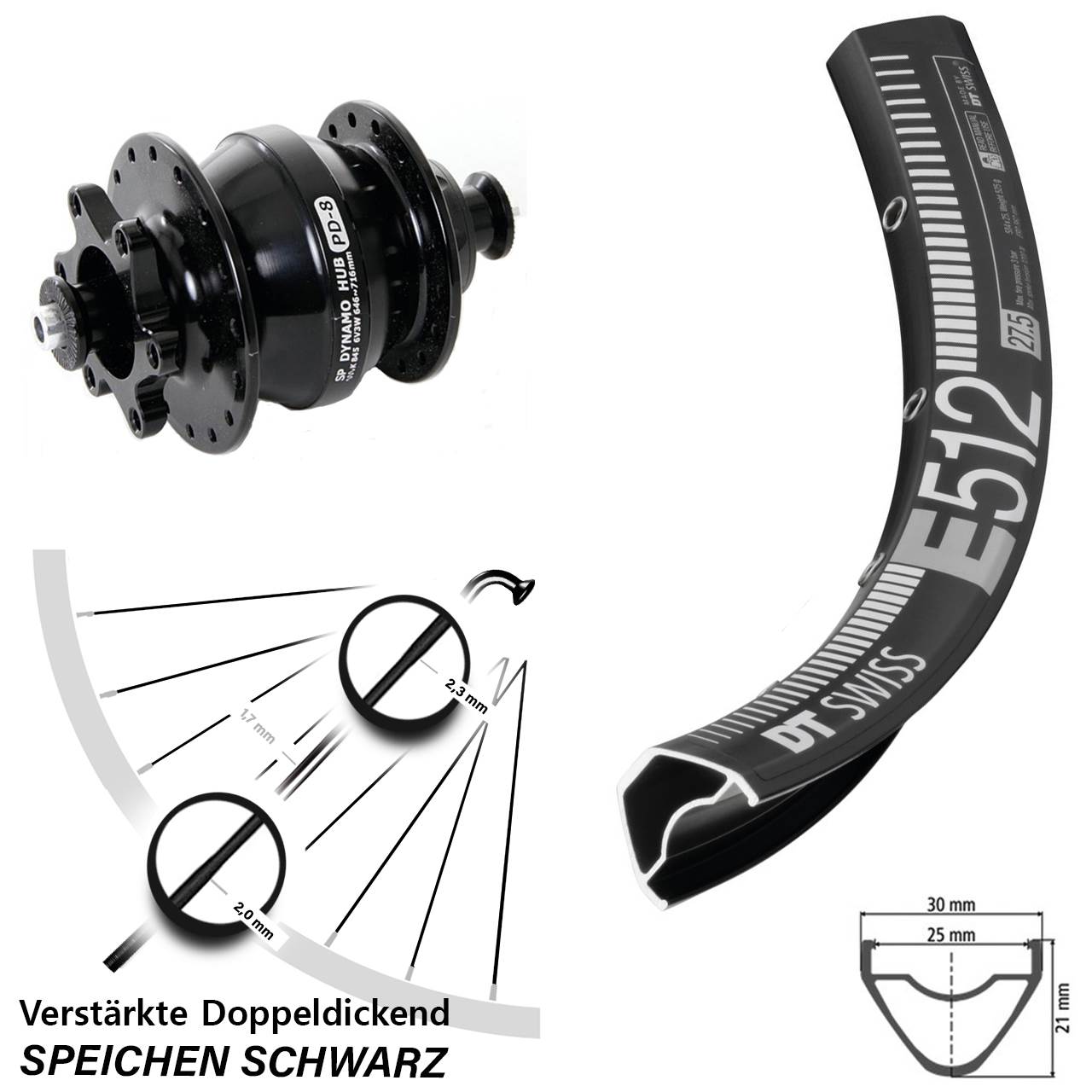 - Vorderrad 27,5 Zoll DT Swiss E 512 schwarz mit Nabendynamo Shutter Precision PD-8 schwarz