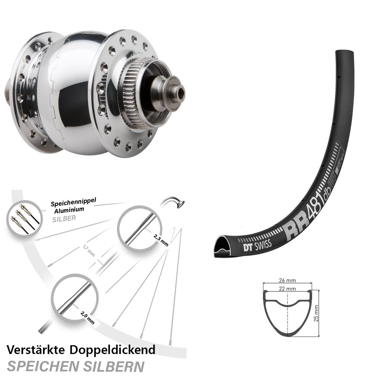 Technische Daten Vorderrad DT Swiss RR 481 Disc schwarz mit Nabendynamo SON delux silbern